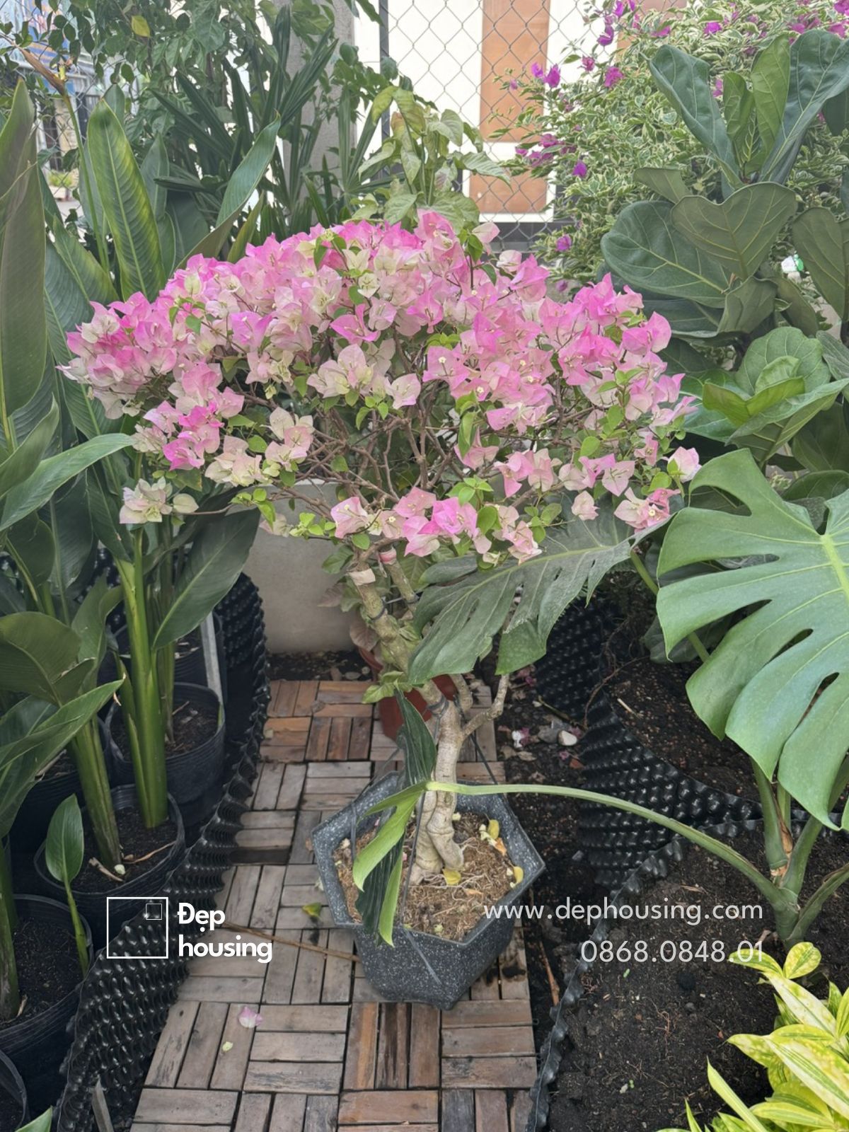Bông giấy hồng sakura có màu hồng phấn đem tới vẻ đẹp nhẹ nhàng, sang trọng cho không gian ban công sân vườn