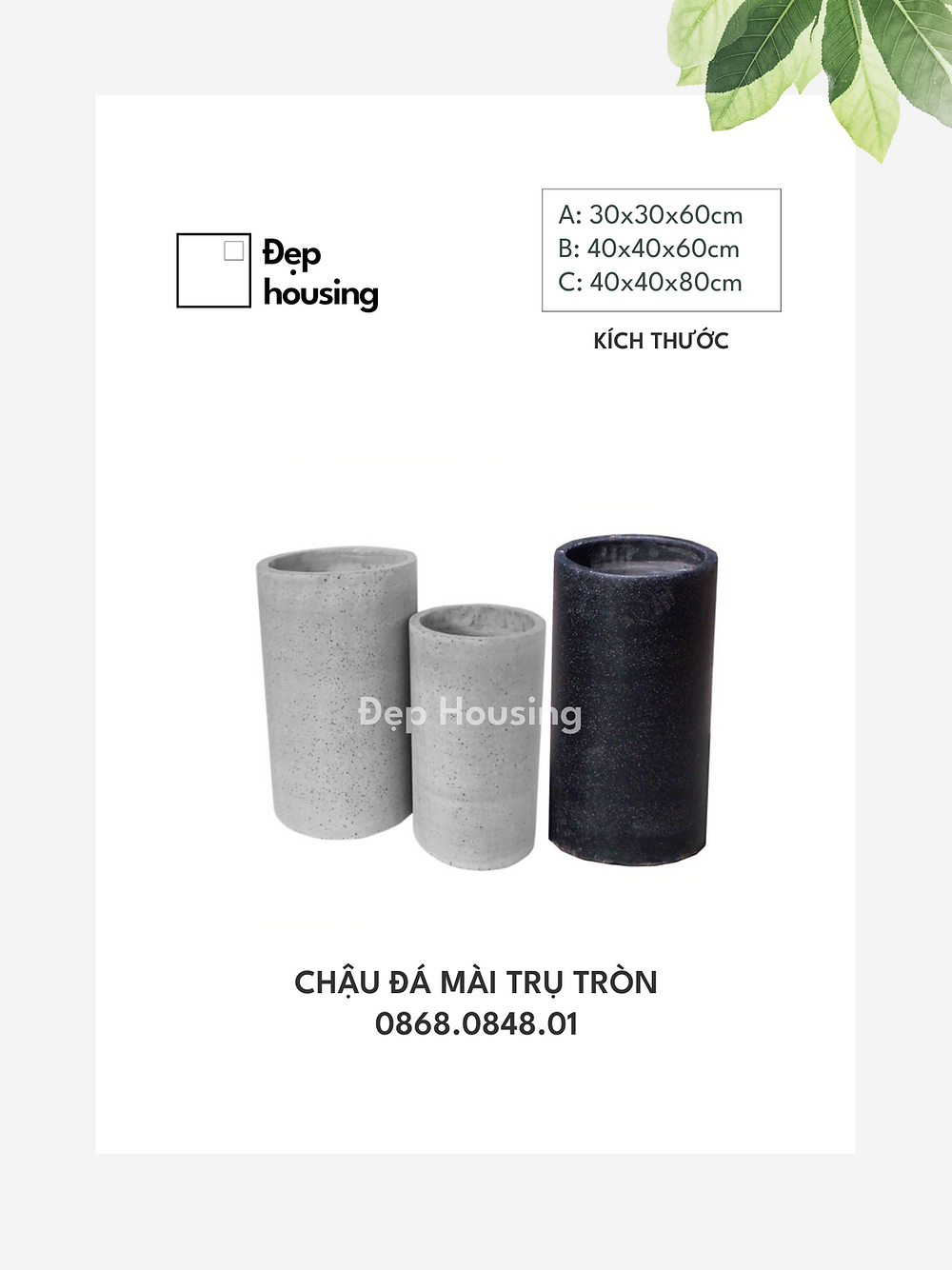 Chậu đá mài kích thước 30x30x60cm (Dài x Rộng x Cao) với 3 màu sắc khác nhau(Trắng / Xám / Đen) để khách hàng lựa chọn.