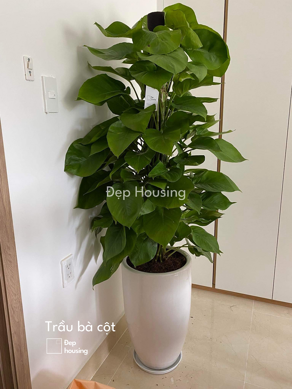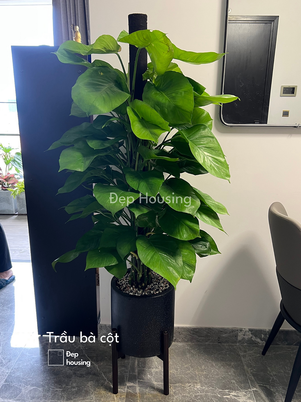 Trầu bà cột phù hợp với nhiều không gian nội thất, đặc biệt là văn phòng nhờ vẻ đẹp sang trọng, bồng bềnh của từng tầng lá trầu bà, đồng thời là loại cây cực dễ trồng và lành tính.